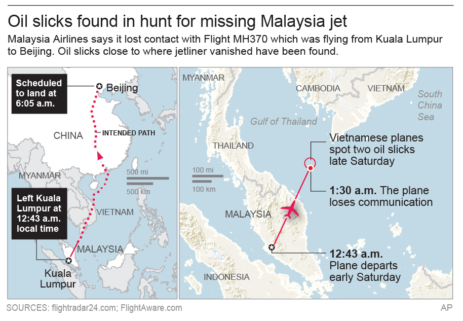 Malaysian maritime officials found some oil slicks in the South China Sea and have sent a sample to a lab to see if it came from the plane.